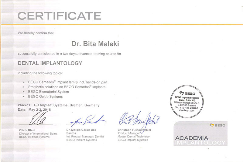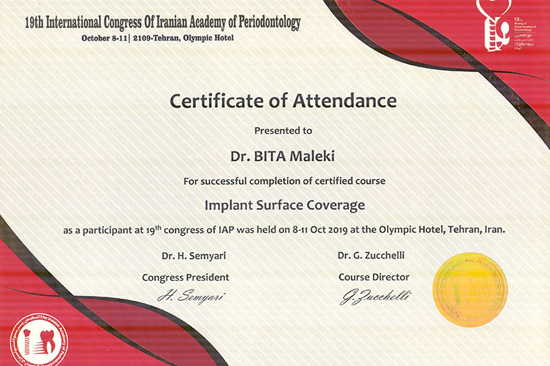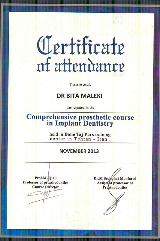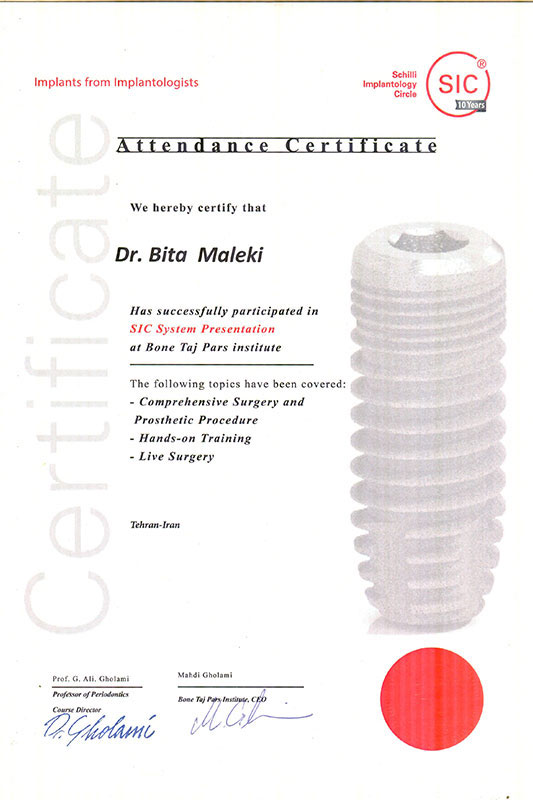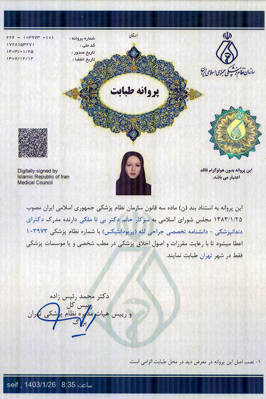 دکتر بیتا ملکی، جراح و متخصص بیماریهای لثه و ایمپلنتهای دندانی (پریودنتیست و ایمپلنتولوژیست)، با بیش از ۲۰ سال تجربه حرفهای در حوزه درمانهای پیشرفته دهان و دندان فعالیت دارد. ایشان فارغالتحصیل دندانپزشکی عمومی از دانشگاه آزاد تهران و دوره تخصصی پریودنتولوژی از دانشگاه علوم پزشکی همدان هستند. همچنین دورههای تکمیلی جراحی پیشرفته ایمپلنت، بازسازی استخوان (GBR) و لیفت سینوس را با موفقیت گذراندهاند که زمینهساز ارائه درمانهای دقیق و مؤثر برای بیماران با نیازهای پیچیده بوده است.