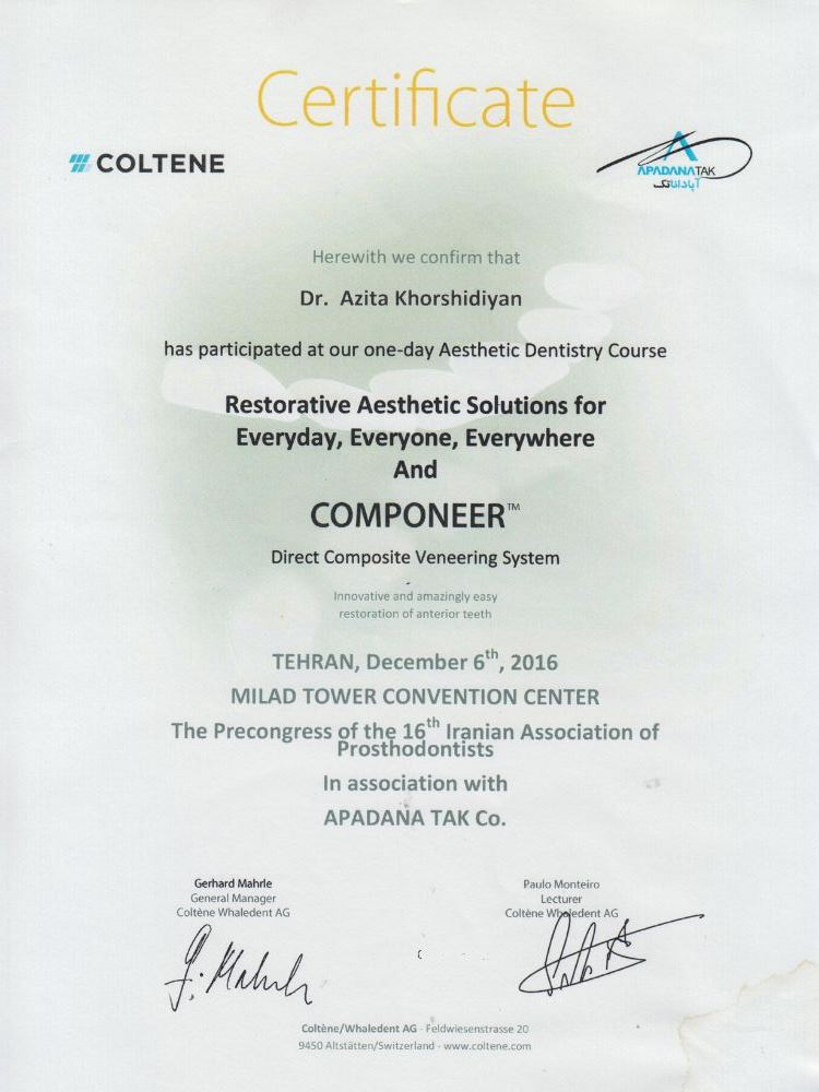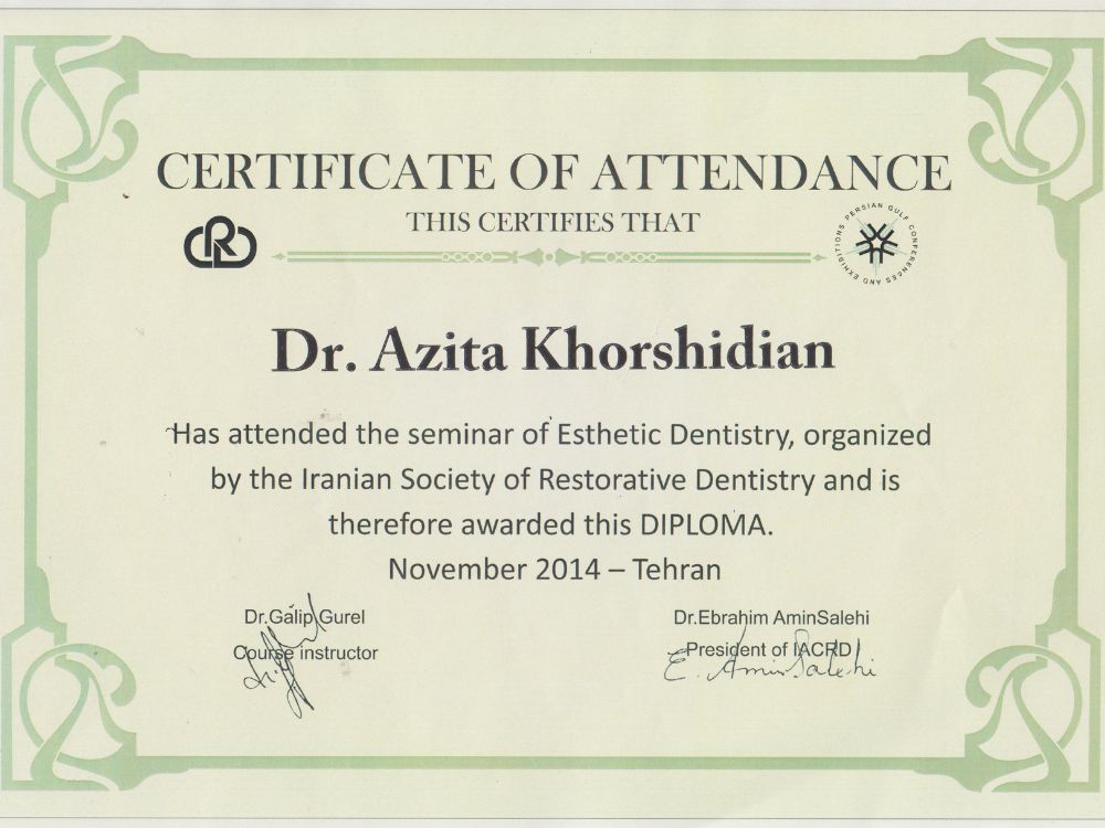 دکتر آزیتا خورشیدیان، متخصص دندانپزشکی کودکان، فارغ‌التحصیل از دبیرستان نمونه مردمی الزهرا، در سال ۱۳۷۶ وارد رشته‌ی دندانپزشکی شد و در سال ۱۳۸۲ پایان‌نامه‌ دکترای خود را در حوزه‌ی درمان‌های دندانپزشکی کودکان با موفقیت به پایان رساند.